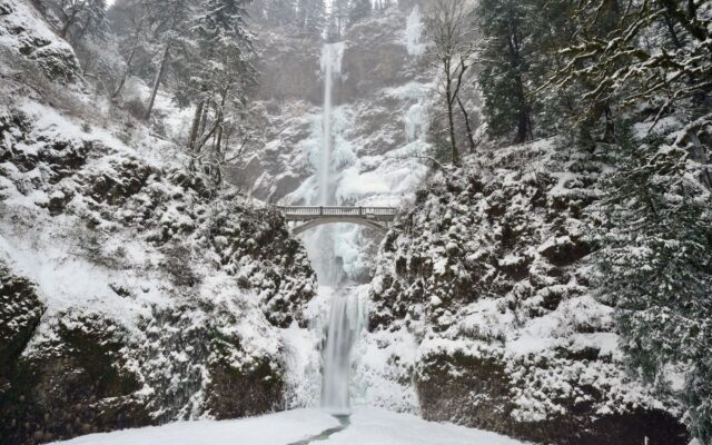 Multnomah Falls in Oregon is one of the top attractions in the Columbia River Gorge, and for the lucky ones who time their visit just right to see Multnomah Falls in winter when it’s surrounded by snow, the scene is unforgettable. Multnomah Falls in winter Since the area typically sees more rain than snow even in the colder months, it’s not very often that this phenomenon happens so be sure