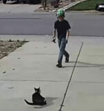 The cat’s true personality comes out as she’s so gentle with her friend and the boy seems so happy to see her and play with her.