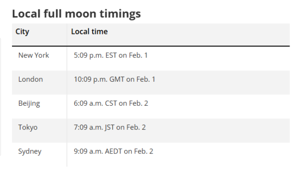February’s full moon will reach peak illumination at 5:09 p.m. EST (2209 GMT) on Feb. 1, when the moon’s orbit places it directly opposite the sun in Earth’s sky, making it appear fully lit from our perspective.