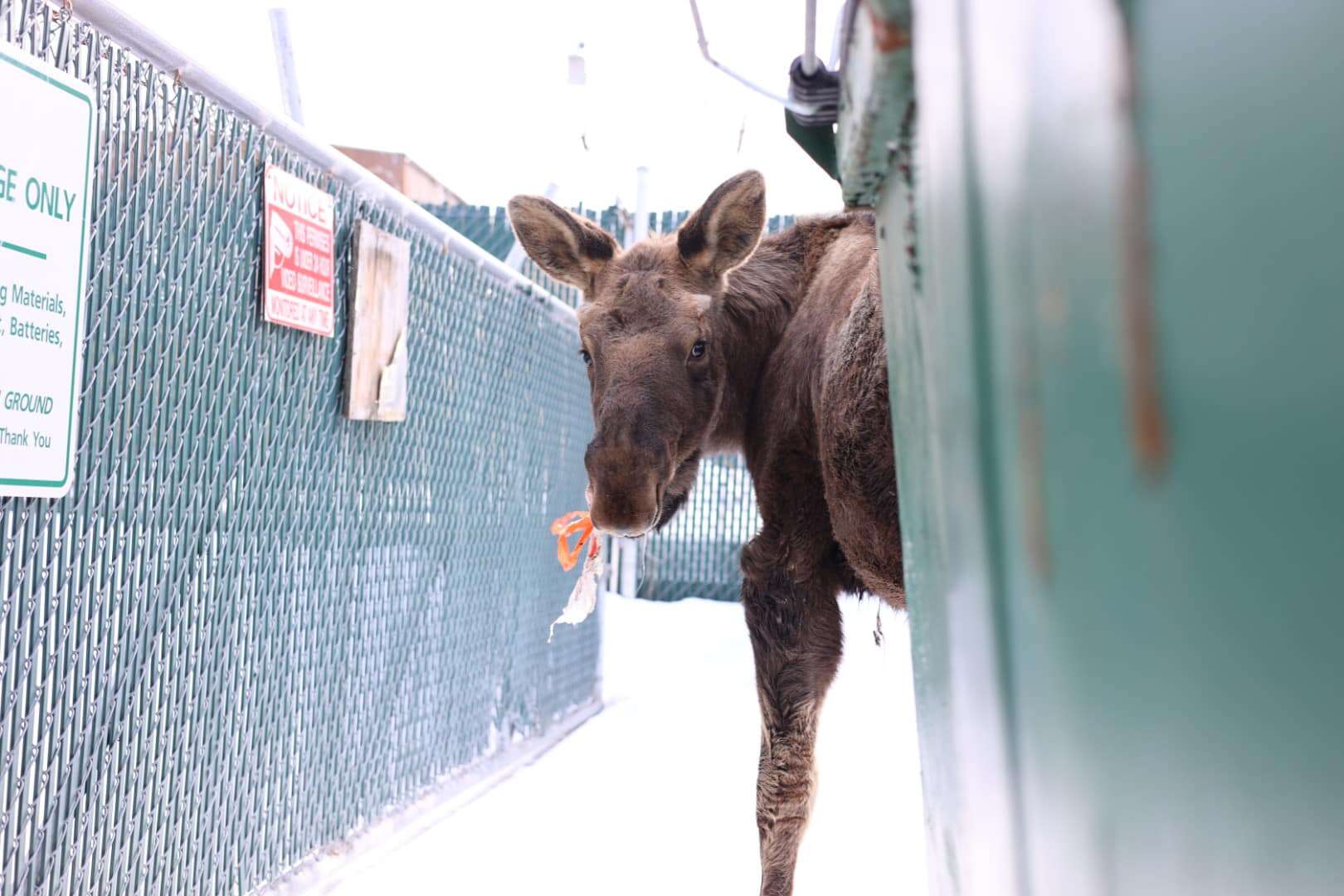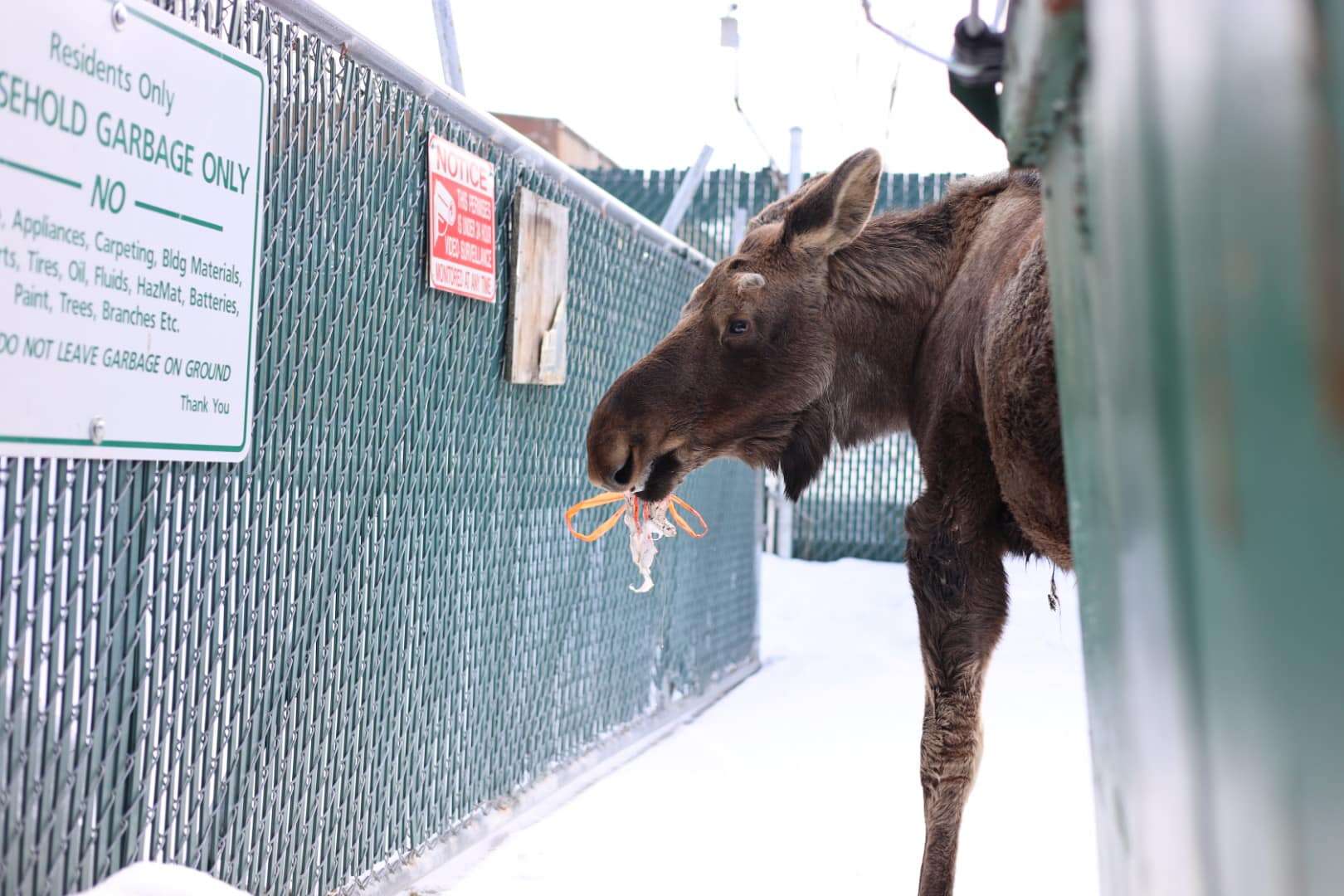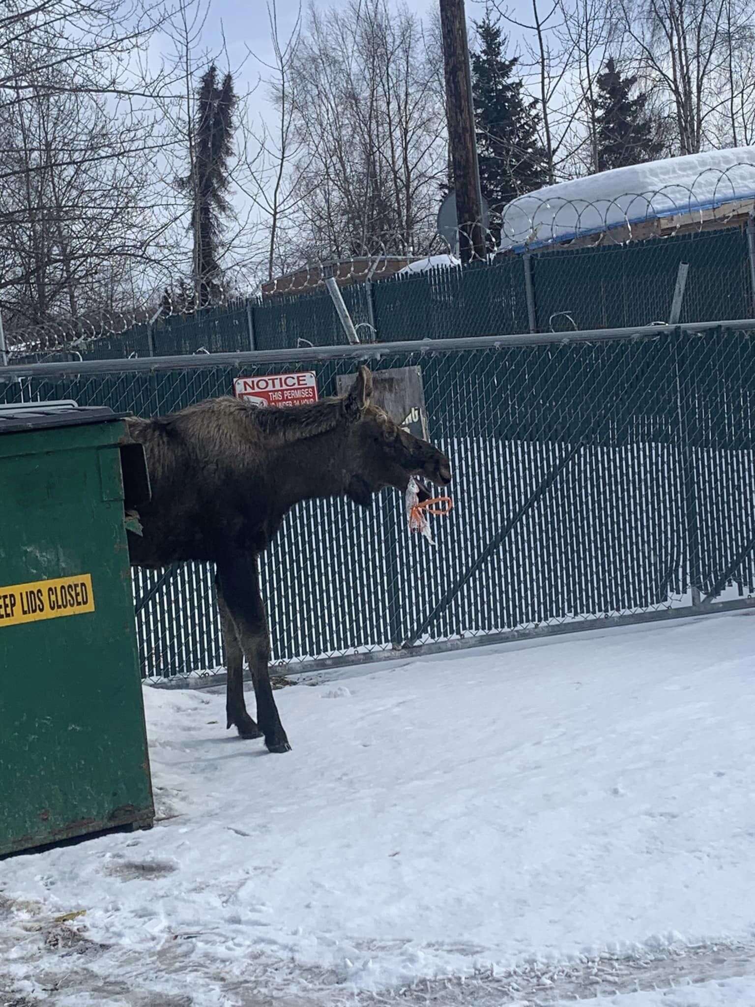 The other day, James West was driving near his home in Alaska when something caught his eye. Lingering behind some dumpsters off the road, West spotted a young moose.