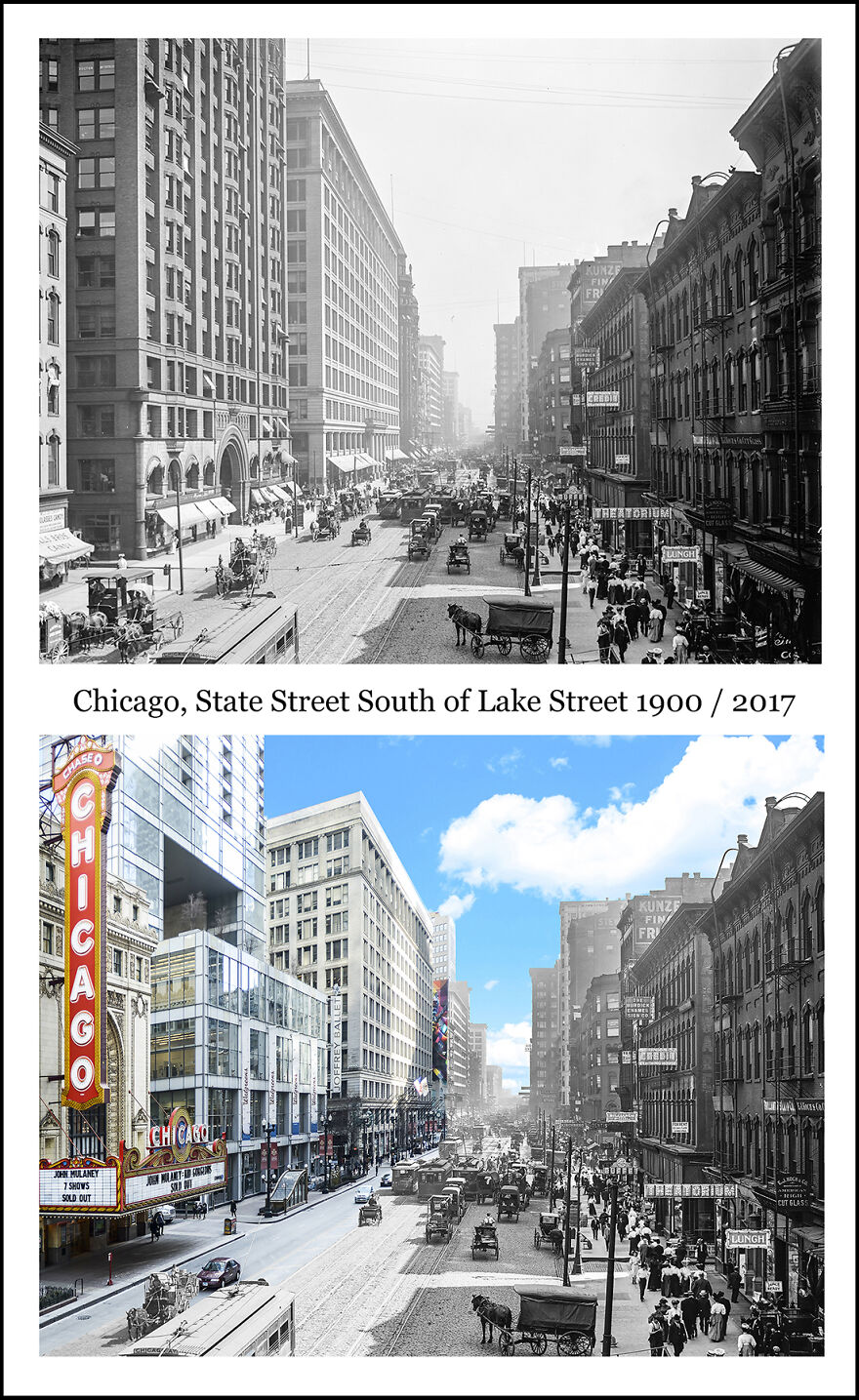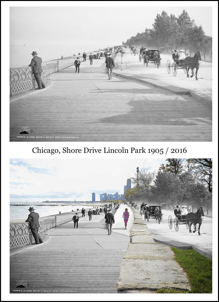 Then one day in 2016 I came across some really old pictures of Chicago, where I have lived for over 20 years. These pictures date back to the late 1800s and early 1900s. I thought it would be interesting to find those locations, take identical pictures a hundred years later, and compare them to the originals. I took a few and looked at them side by side with the originals. I didn’t even know there was a name for this: rephotography – pictures taken of the same place from the same vantage point at two different moments in time.