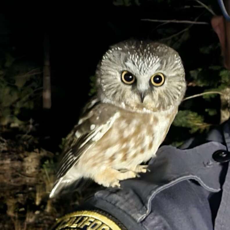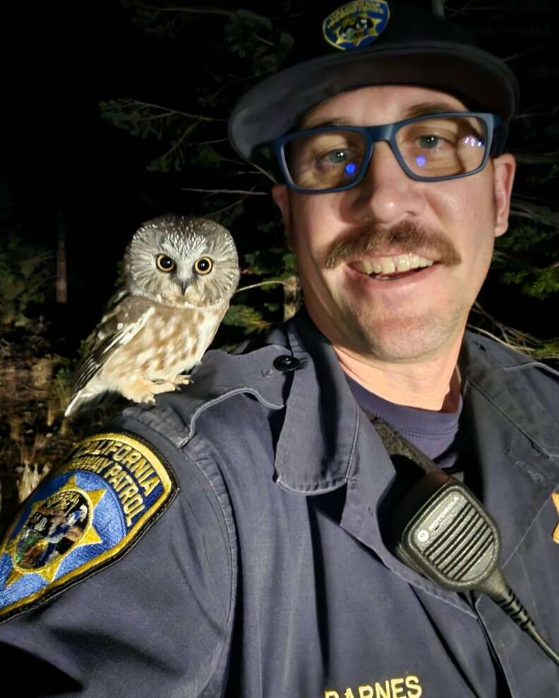 “[Barnes] bent down and picked up the small creature,” CHP – South Lake Tahoe wrote. “The small owl promptly walked up his arm and perched on his shoulder.”