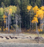 Yellow and green aspen trees near a herd of bison