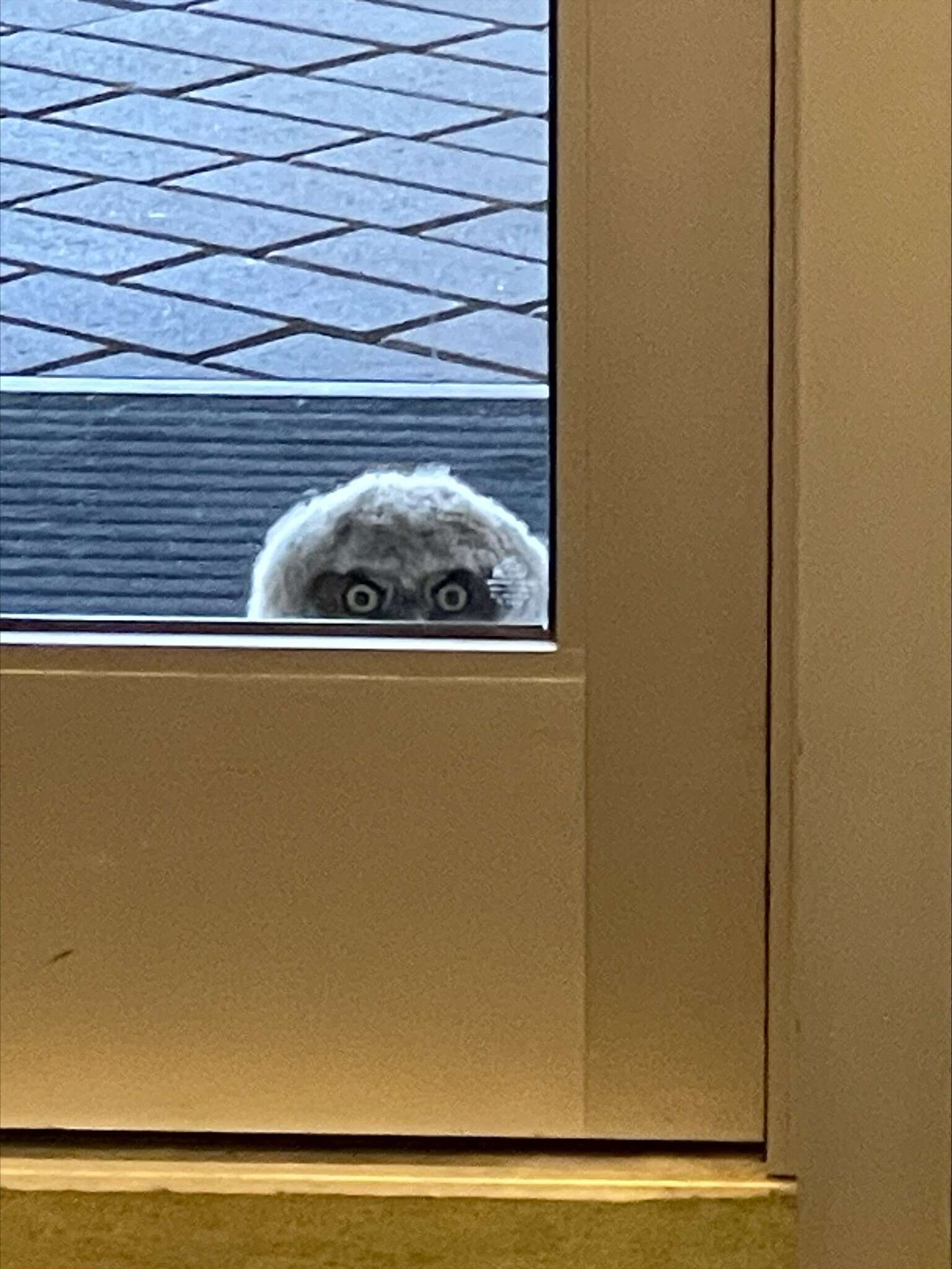 Here’s footage of the owl back near his nest, surveying the area beyond which he’d entered just a bit too early.