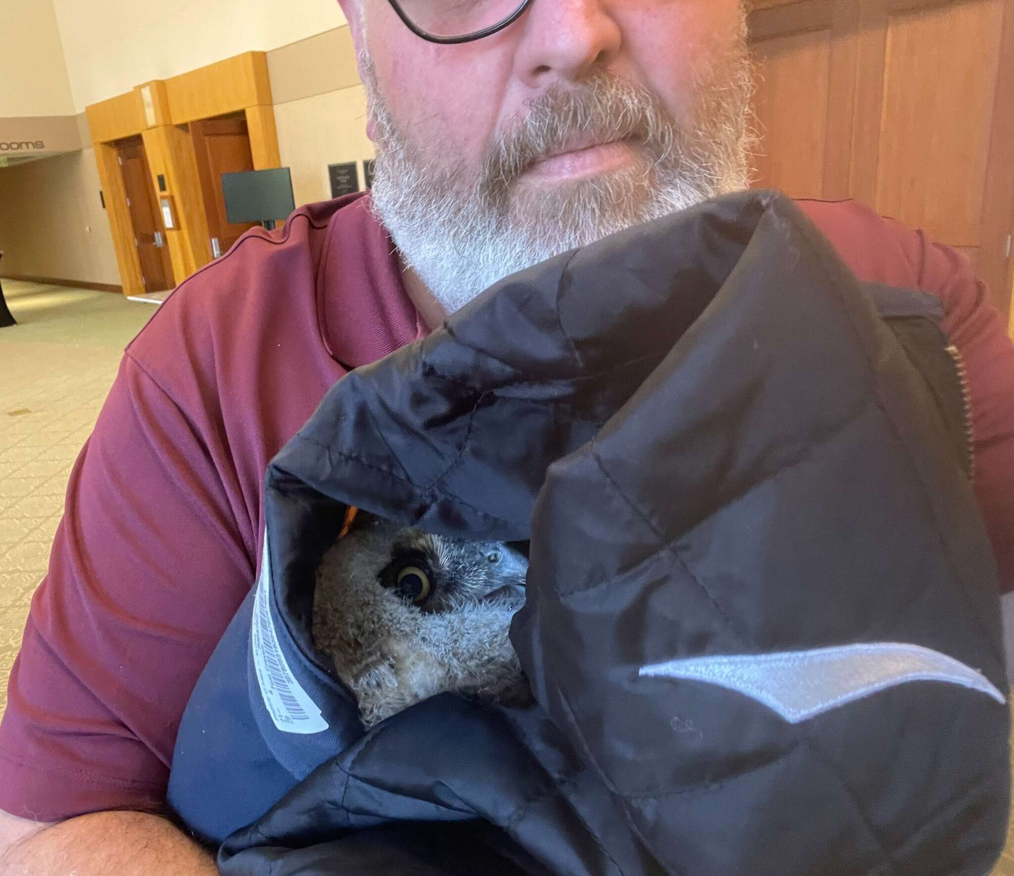 Fortunately, a staff member was able to collect the stranded owl, wrapping him up in a jacket.
